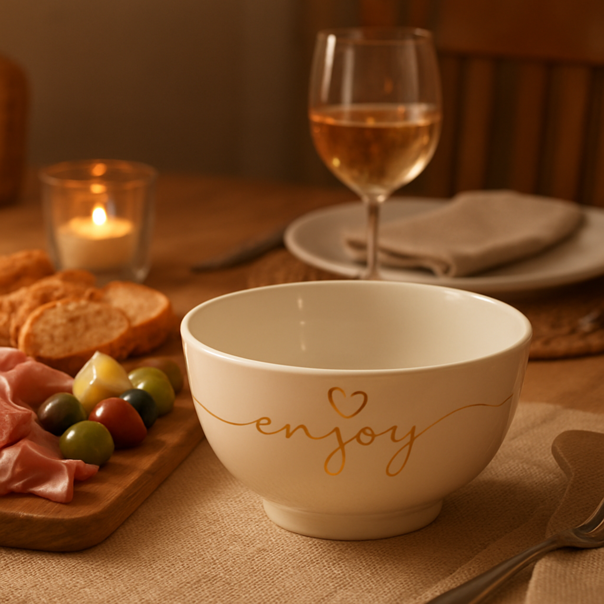 Start de dag met stijl! Deze elegante rosékleurige ontbijtkom is voorzien van het gouden opschrift Enjoy en geeft je ontbijttafel meteen een luxueuze touch. Ideaal voor yoghurt, granola, cornflakes, soep of snacks.